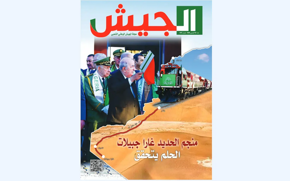 وتوقفت المجلة عند الحدث الاقتصادي بالقول أن “بلادنا تعيش هذا الشهر على وقع إنجاز تاريخي كبير عقب إعلان رئيس الجمهورية، القائد الأعلى للقوات المسلحة، وزير الدفاع الوطني, السيد عبد المجيد تبون, رسميا, انطلاق استغلال خط السكة الحديدية المنجمي الغربي بشار-تندوف-غارا جبيلات, الممتد على مسافة 950 كلم, وإعطاء إشارة انطلاق قطار نقل أولى شحنات خام الحديد من منجم غارا جبيلات باتجاه وهران مرورا ببشار”.